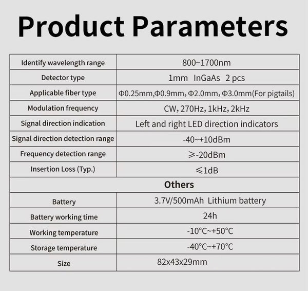 This fibre optic identifier is designed for fast and safe identification of live optical fibres without disconnecting or interrupting service. It allows technicians to determine signal presence, direction, and relative power levels directly on the fibre, making it ideal for installation, maintenance, and troubleshooting tasks.